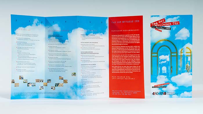 Für den Tag der offenen Tür der Bayerischen Staatsbibliothek entwickelten wir eine Fotocollage, die das Gebäude selbst öffnete und von Himmel und Wolken durchfluten ließ. Dieses Key Visual wurde Grundlage für Plakate, Flyer und Anzeigen im einheitlichen Erscheinungsbild.